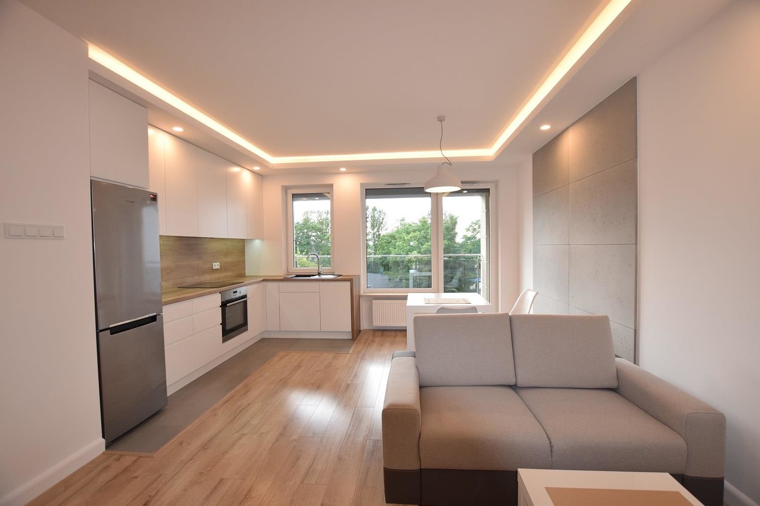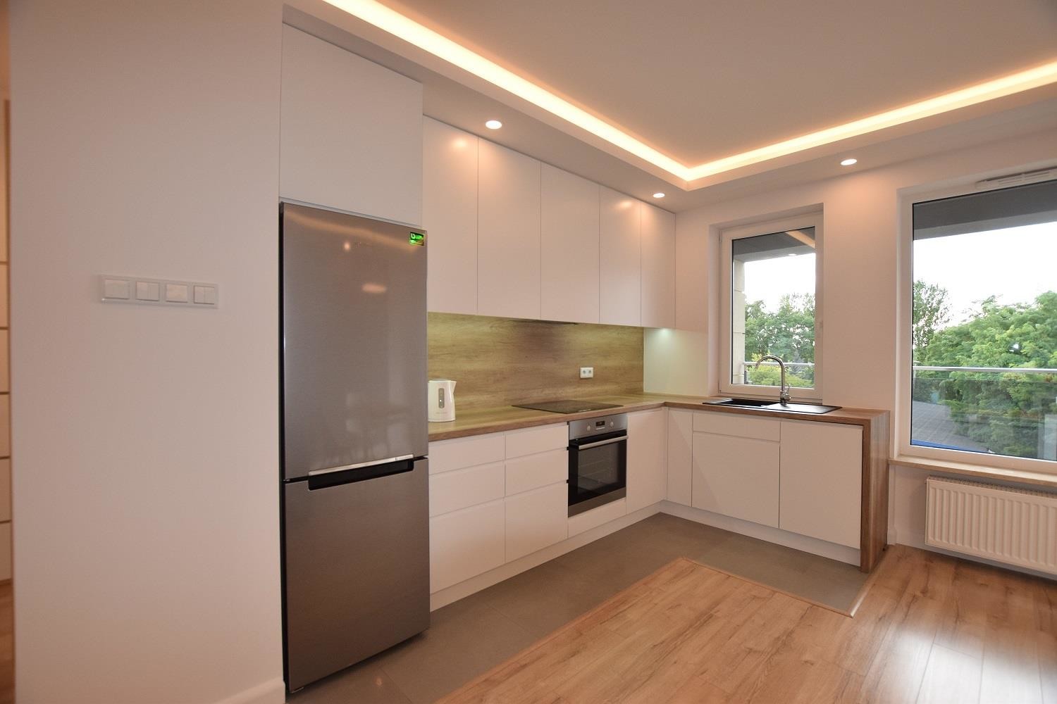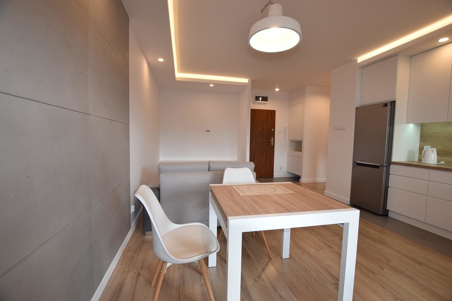 Salon dzienny częściowo otwarty na kuchnię. Kuchnia w nowej zabudowie oraz z kompletnym sprzętem AGD. W pokoju dziennym kanapa z funkcją spania. Wyjście na balkon.
