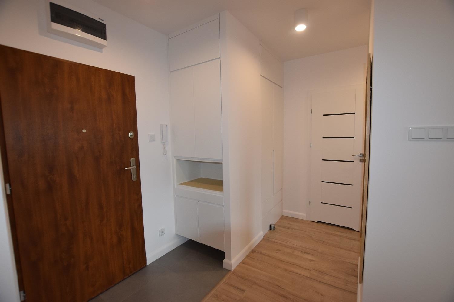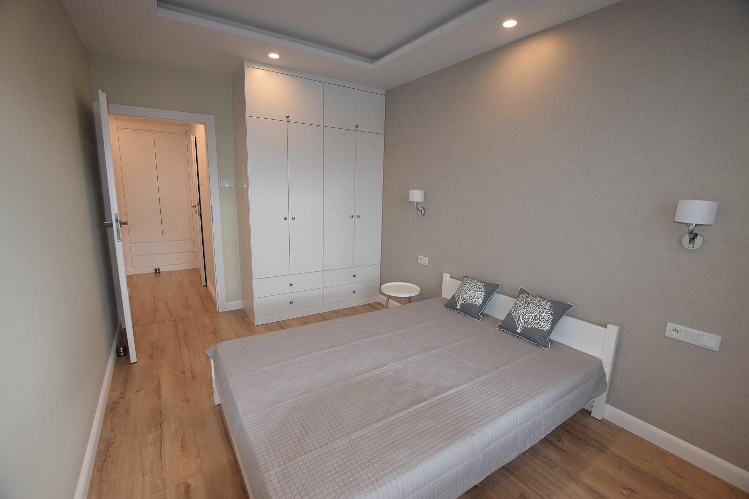 Sypialnia z komfortowym łóżkiem. Wyposażona również w komodę. W przedpokoju szafa zabudowana, z licznymi półkami i szufladami.