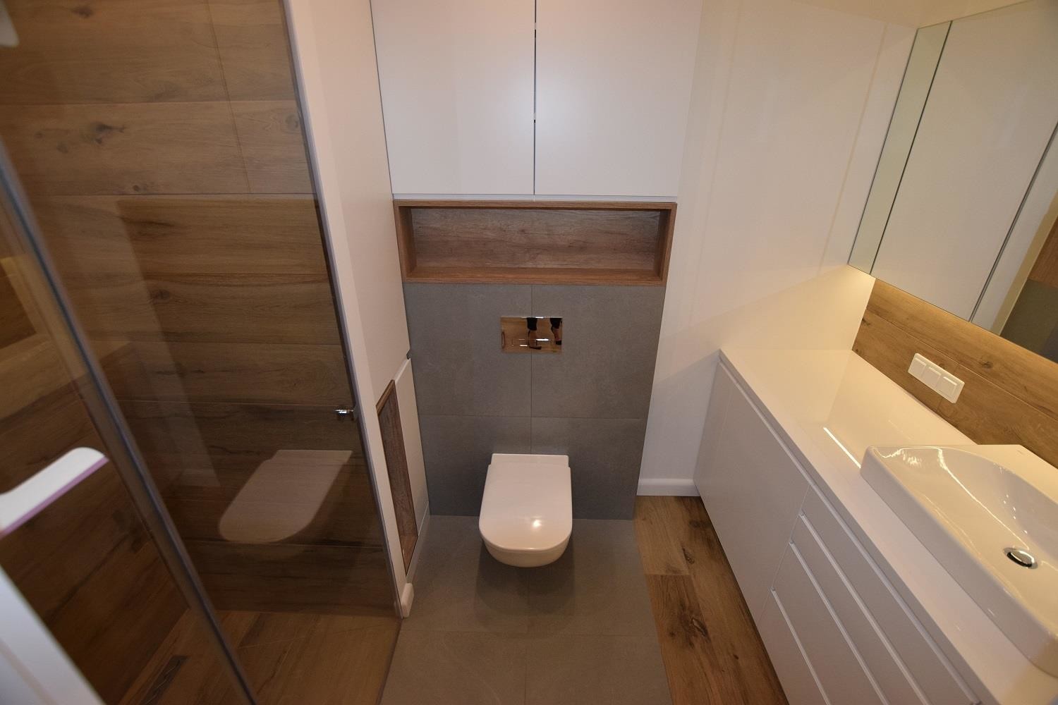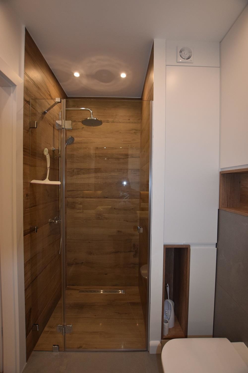 Łazienka z prysznicem wykończona zgodnie z najnowszymi standardami. Wyposażona w nowa pralkę.