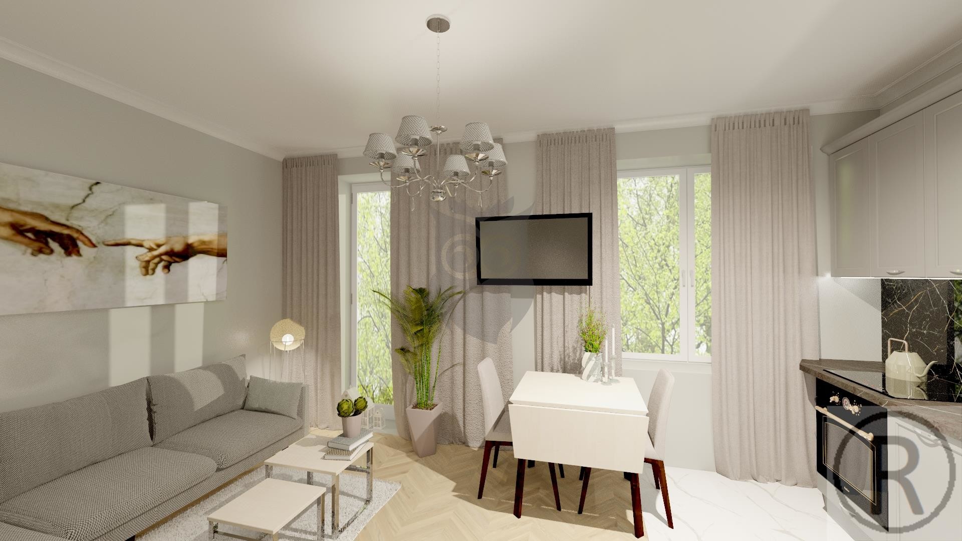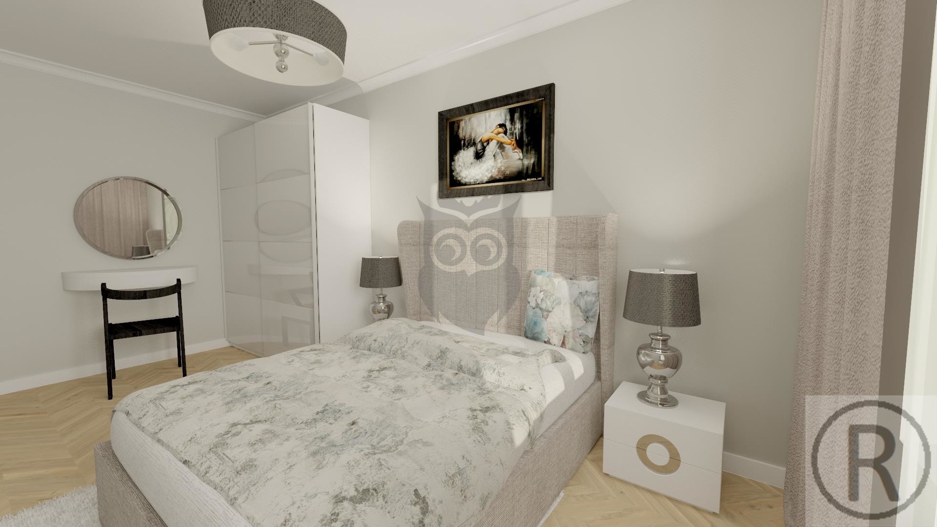 Przestrzeń mieszkalną stanowi pokój dzienny z aneksem kuchennym, sypialnia, łazienka z WC oraz przedpokój.