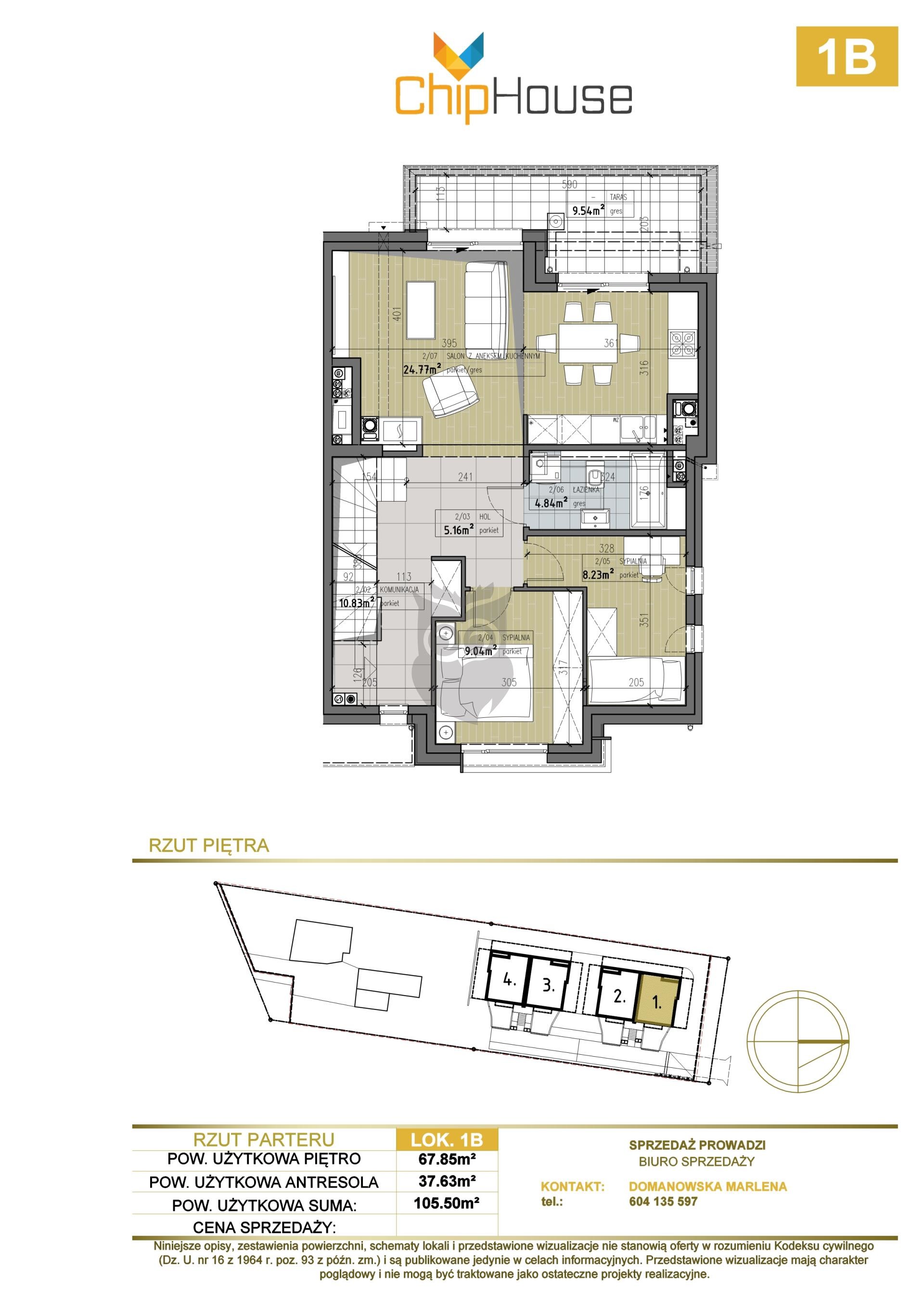 Poziom I: komunikacja/holl - 10.83m2, korytarz 5.16m2, salon z kuchnią - 24.77m2, sypialnia 9.04m2, sypialnia 8.23m2, łazienka 4.84m2.