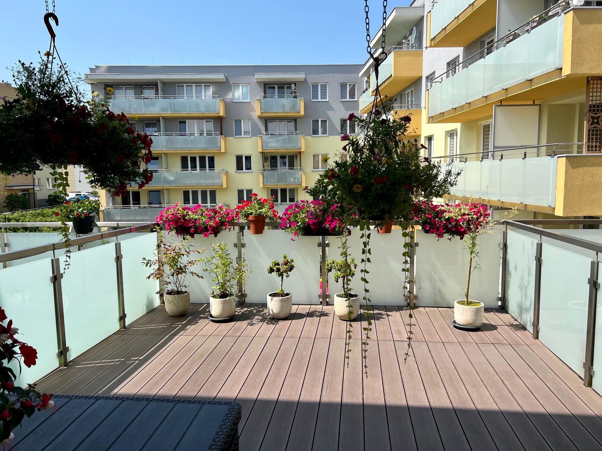 Przestrzeń mieszkalną stanowi kuchnia otwarta na pokój dzienny, z wyjściem na taras o powierzchni 25m2. Dwie niezależne sypialnie, duża łazienka.