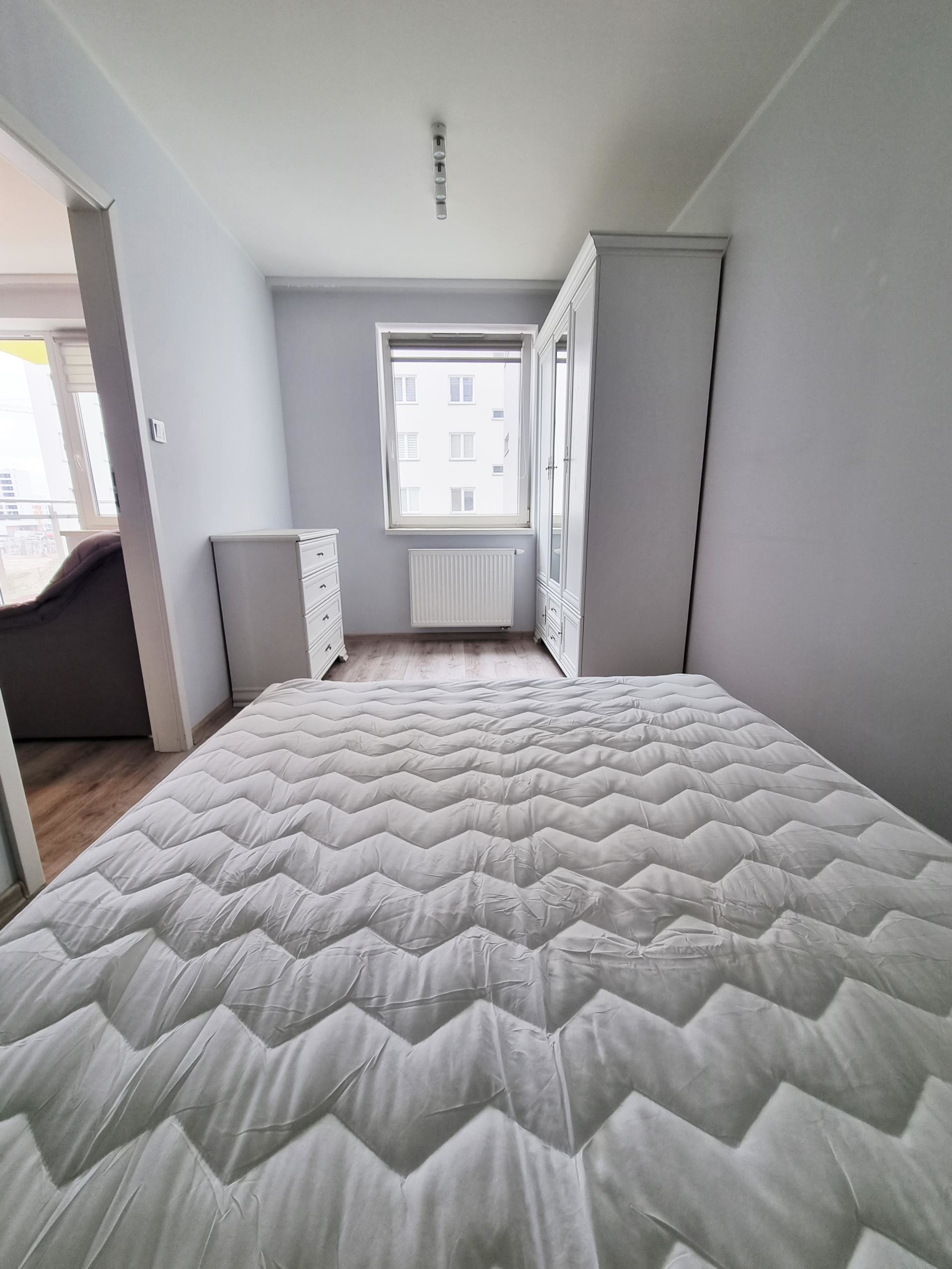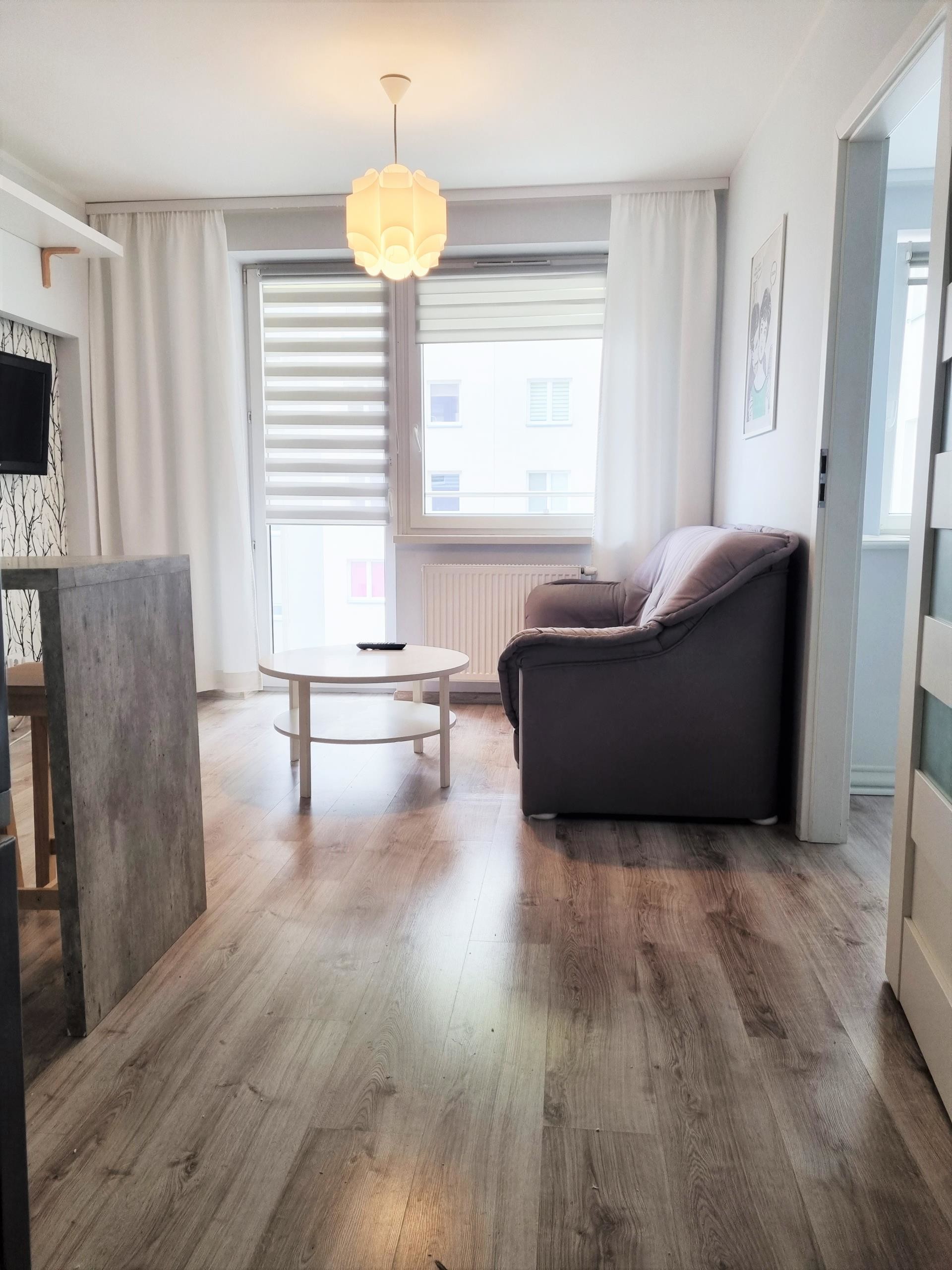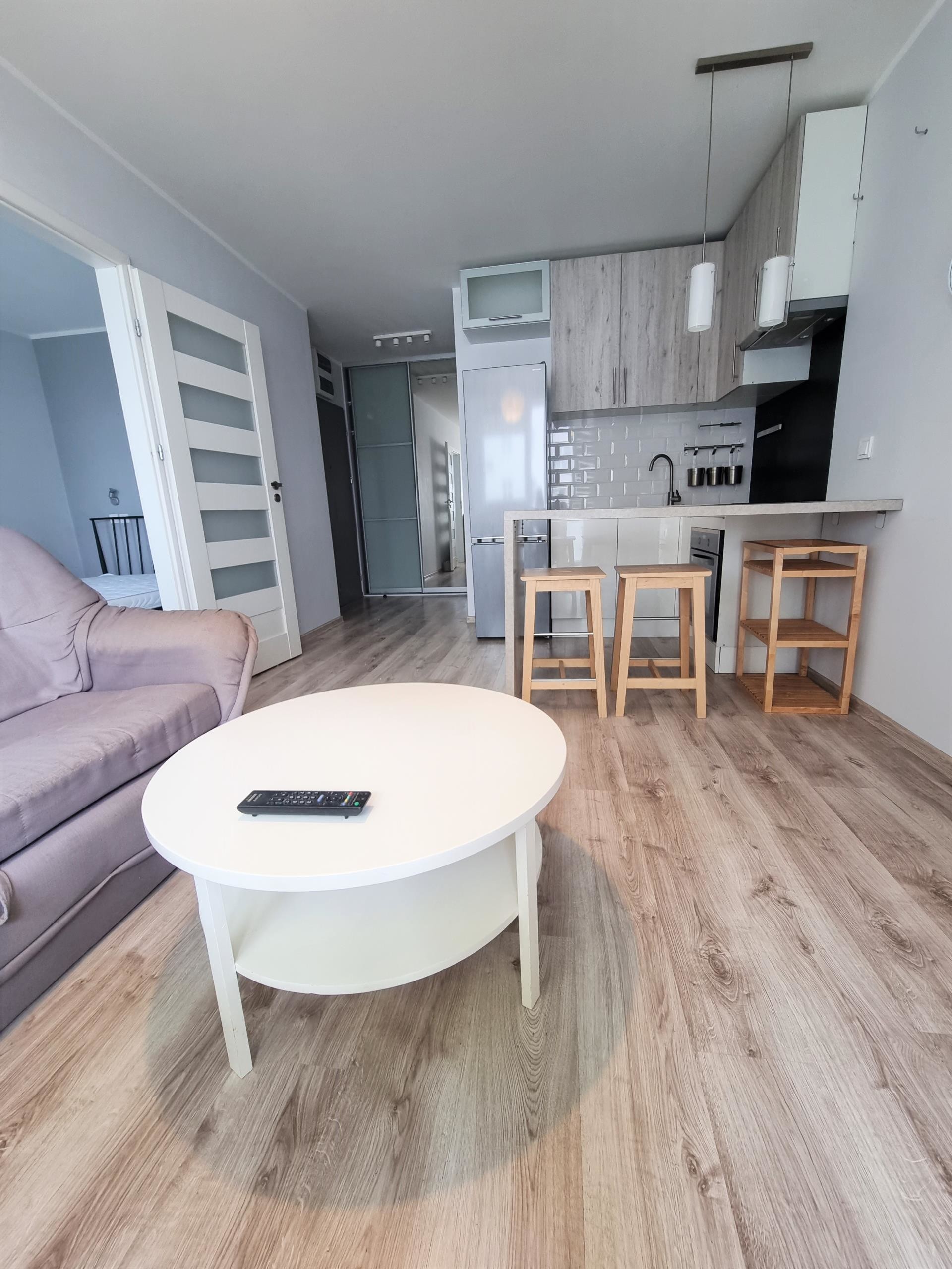Przestrzeń mieszkalną stanowi: sypialnia ( wyposażona w łóżko, nowy materac, zestaw mebli wolno stojących), kuchnia połączona z salonem ( zabudowa stała kuchni, sprzęt AGD, sofa i stolik kawowy) oraz łazienka łącznie w WC ( prysznic oraz pralka). W przedpokoju znajduje się pojemna szafa w zabudowie stałej.