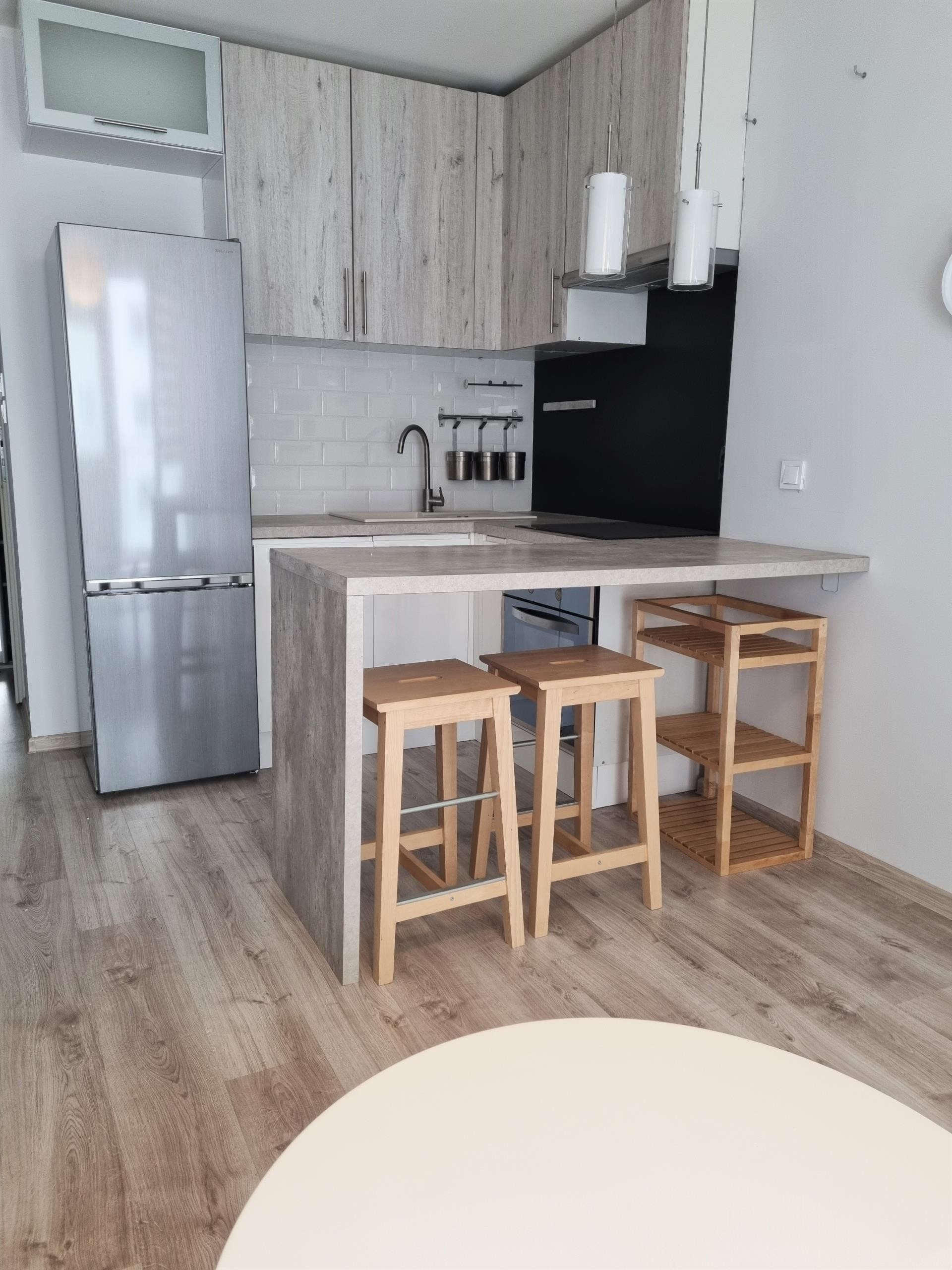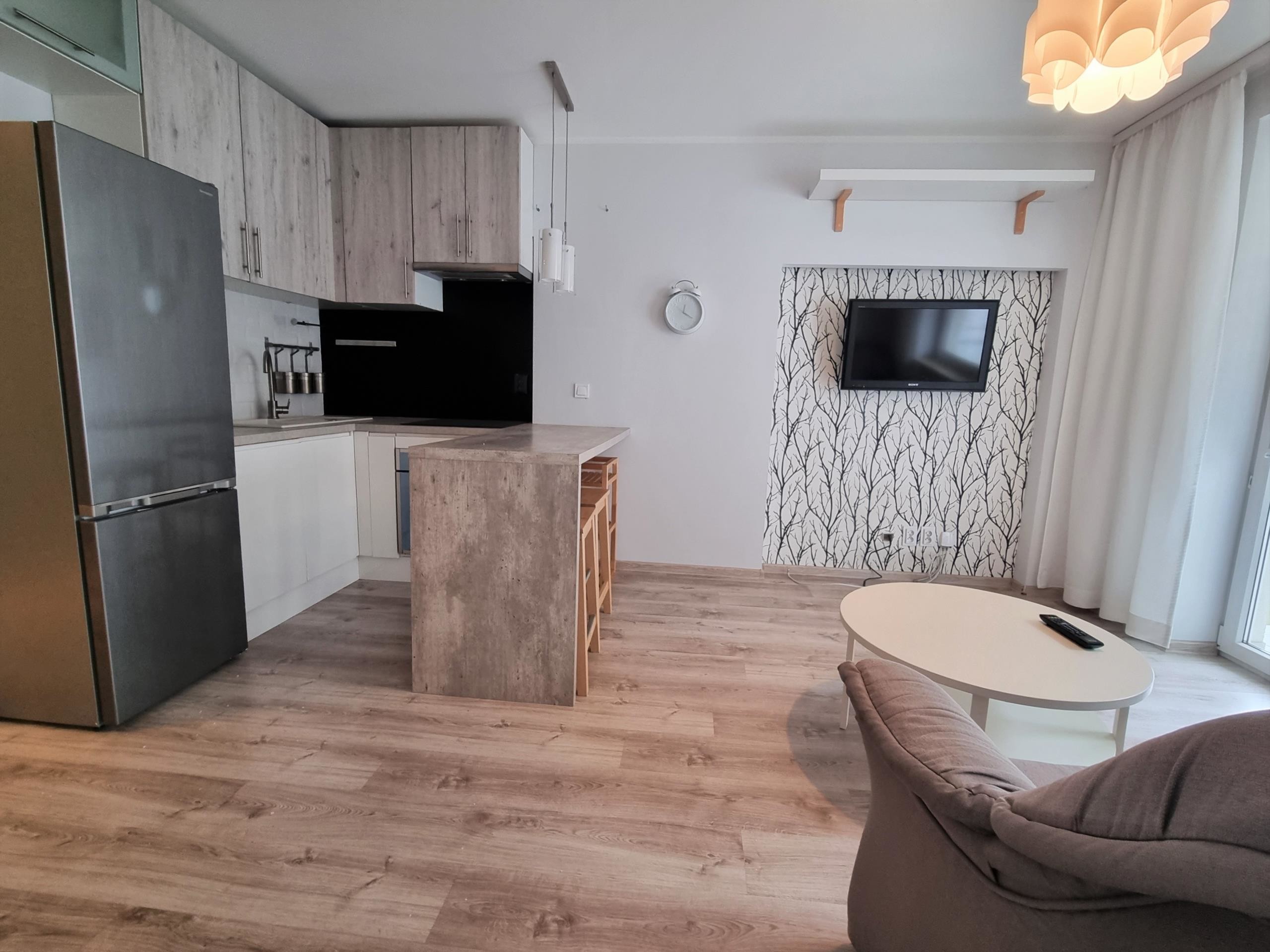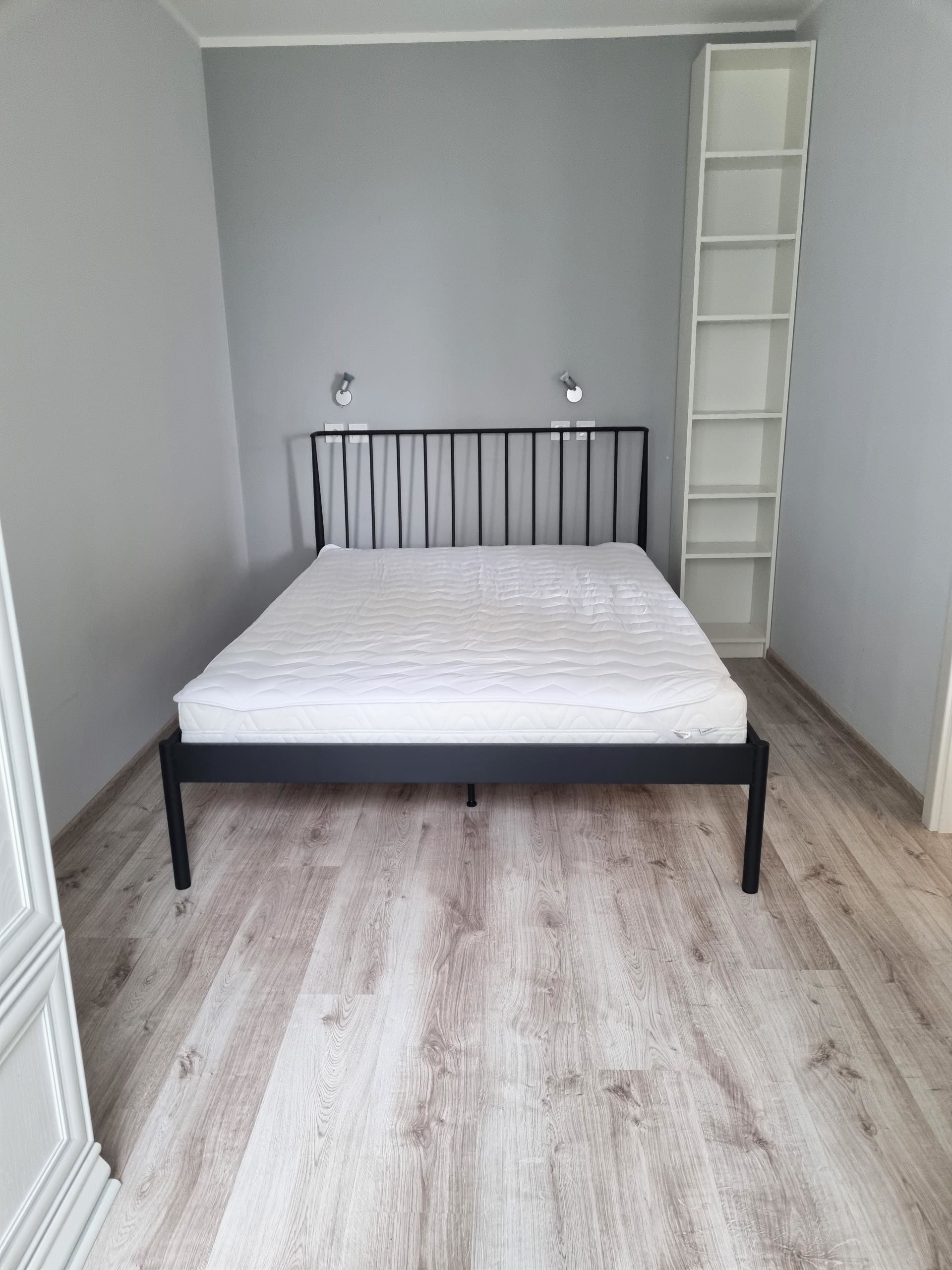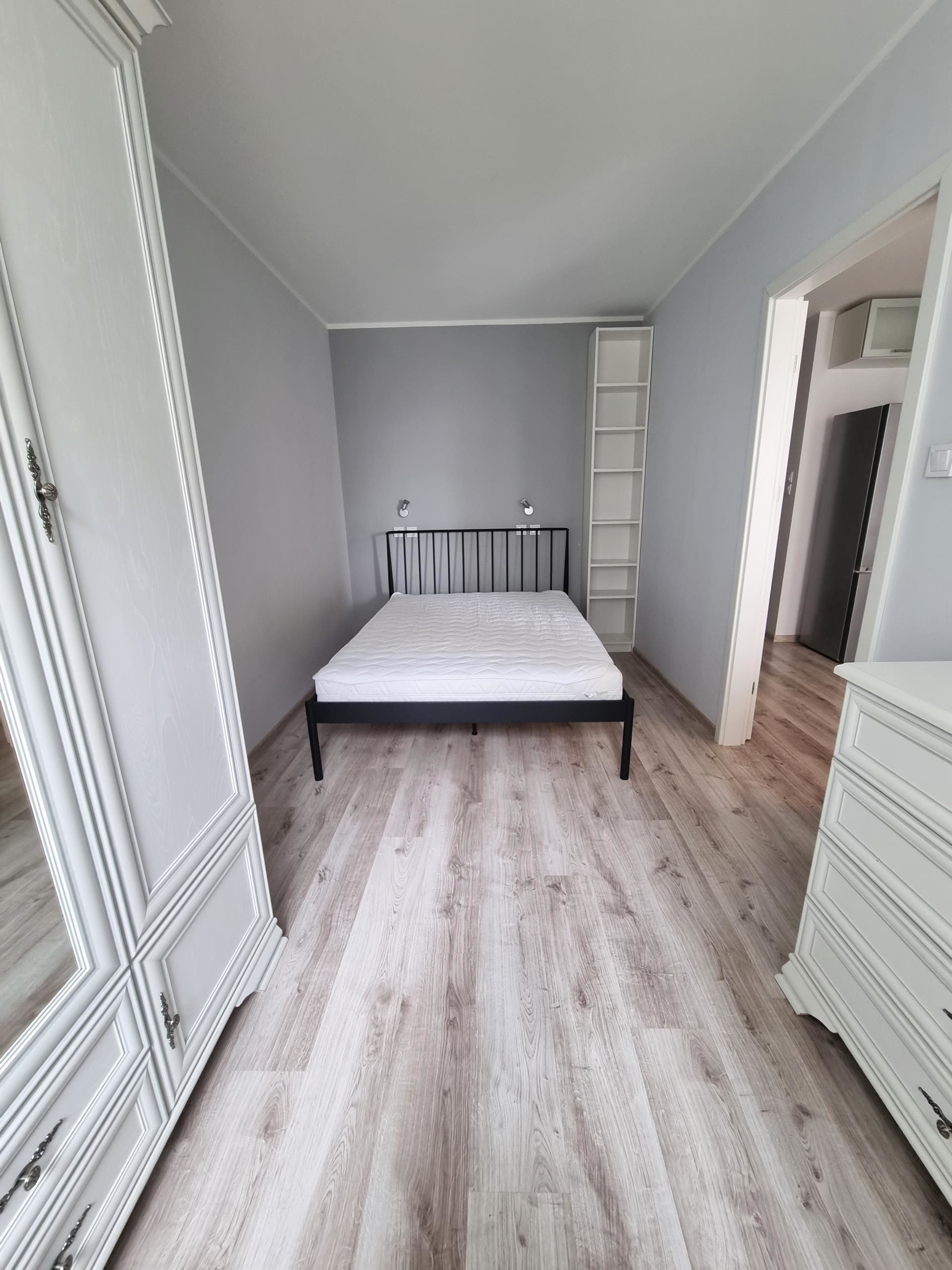 Przestrzeń mieszkalną stanowi: sypialnia ( wyposażona w łóżko, nowy materac, zestaw mebli wolno stojących), kuchnia połączona z salonem ( zabudowa stała kuchni, sprzęt AGD, sofa i stolik kawowy) oraz łazienka łącznie w WC ( prysznic oraz pralka). W przedpokoju znajduje się pojemna szafa w zabudowie stałej.