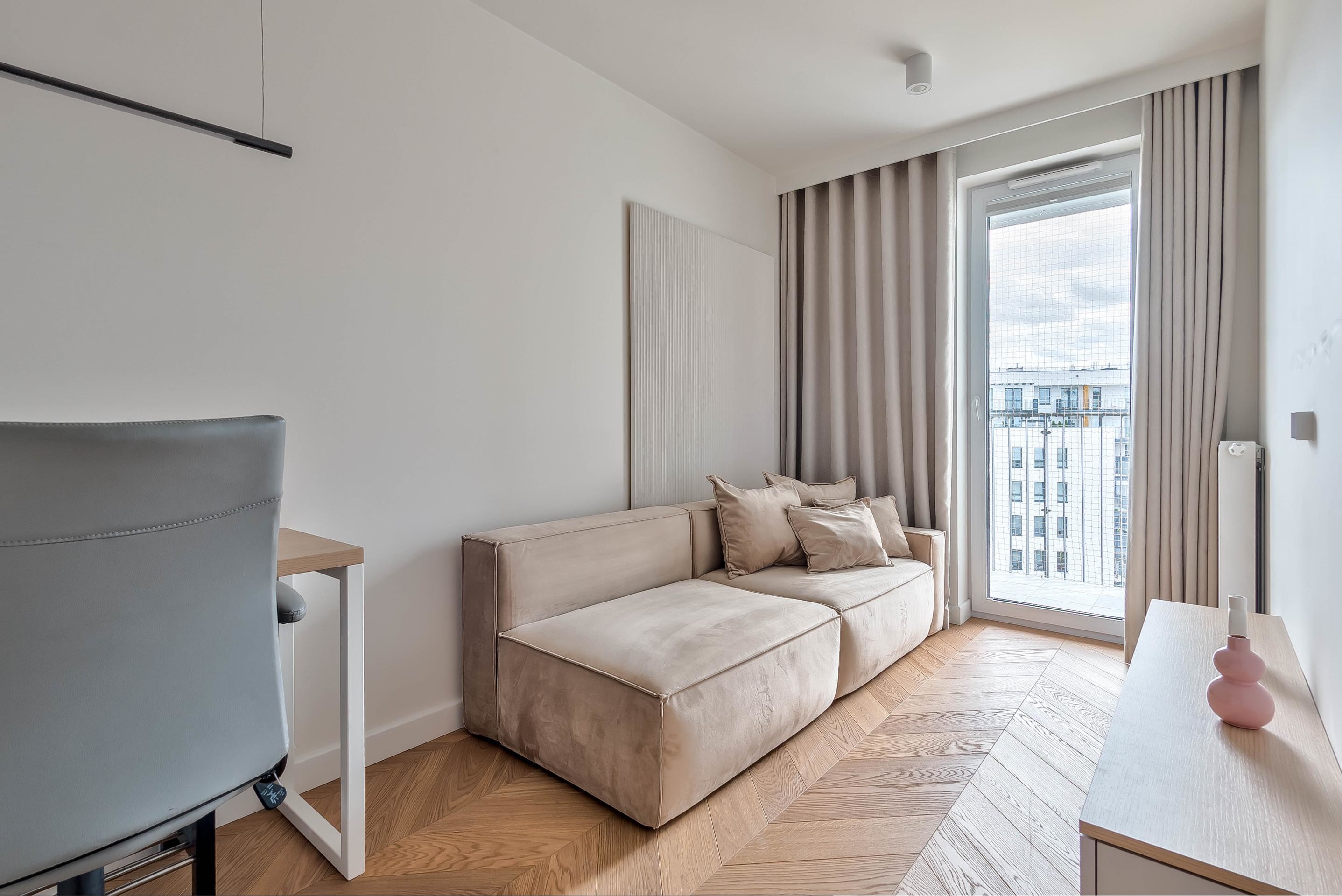 Lokal mieszkalny przy Kopernika 2 o powierzchni 55.84m2, zlokalizowany na VI piętrze, w nowym 3 letnim apartamentowcu z windą. Przestrzeń stanowi salon dzienny z wyjściem na duży balkon, oddzielna sypialnia, gabinet łazienka z WC. Mieszkanie wyposażone i kompletnie umeblowane,