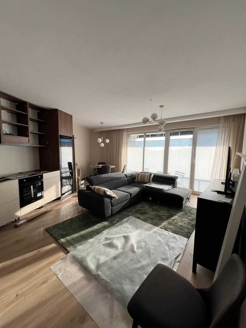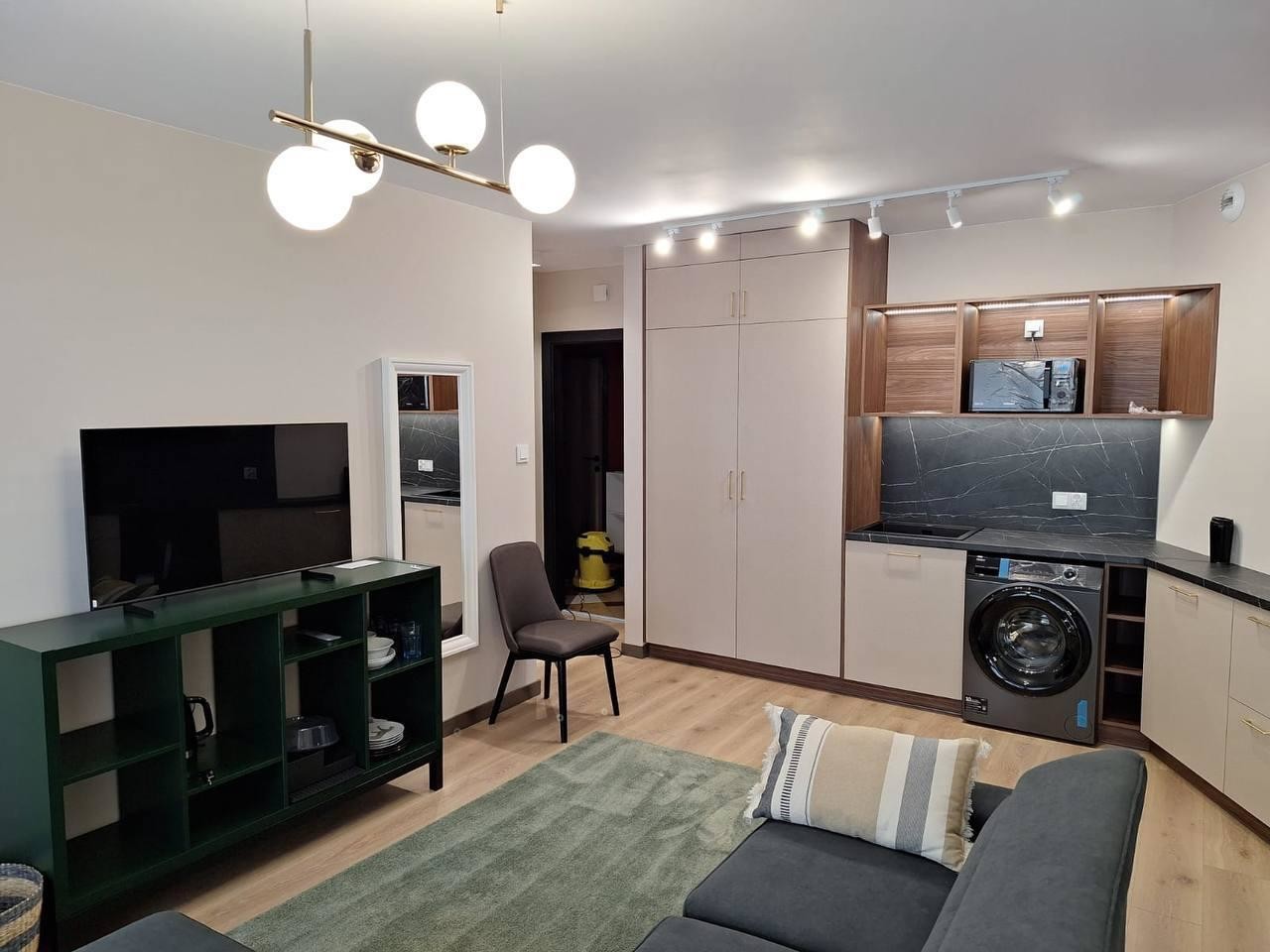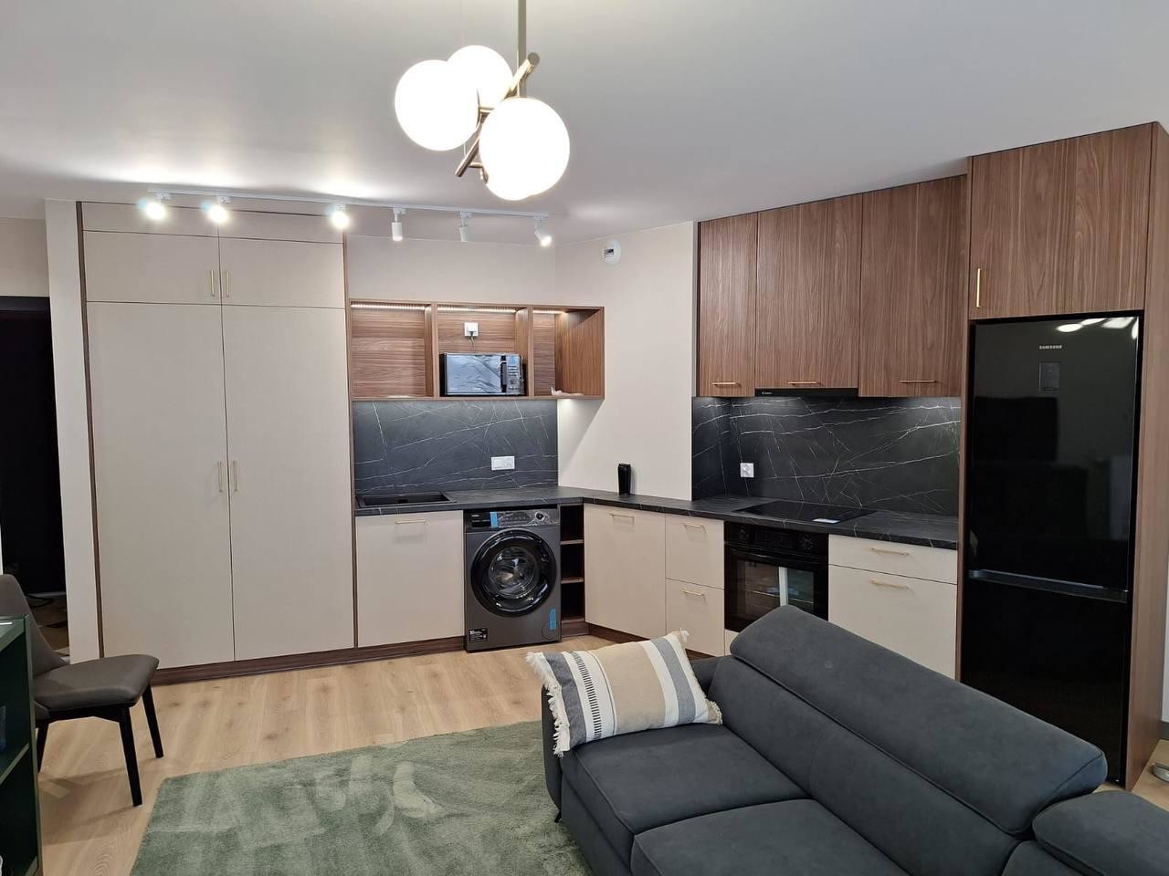 Wnętrze nowe, wyposażone w kanapę z funkcją spania, zestaw wolnostojących mebli, kuchnia wyposażona w zabudowę stała, sprzęt AGD, stolik kawowy.