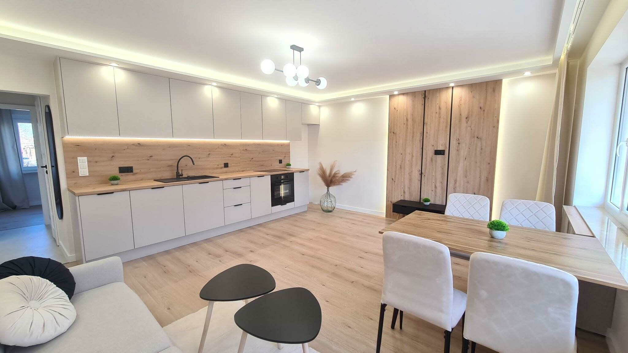 Mieszkanie wyposażone jest w zabudowy stałe w kuchni wykonane przez stolarza. Kuchnia wyposażona w sprzęty AGD (wszystko na gwarancji)